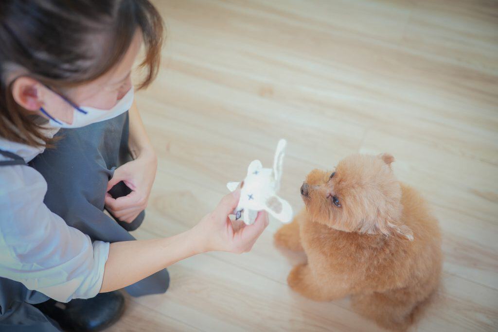トリミング後のお迎えまでの時間は一緒に一緒に遊ぶことでその子の性格を理解し、ゆっくりと信頼関係を築いていくことを大切にしています。
